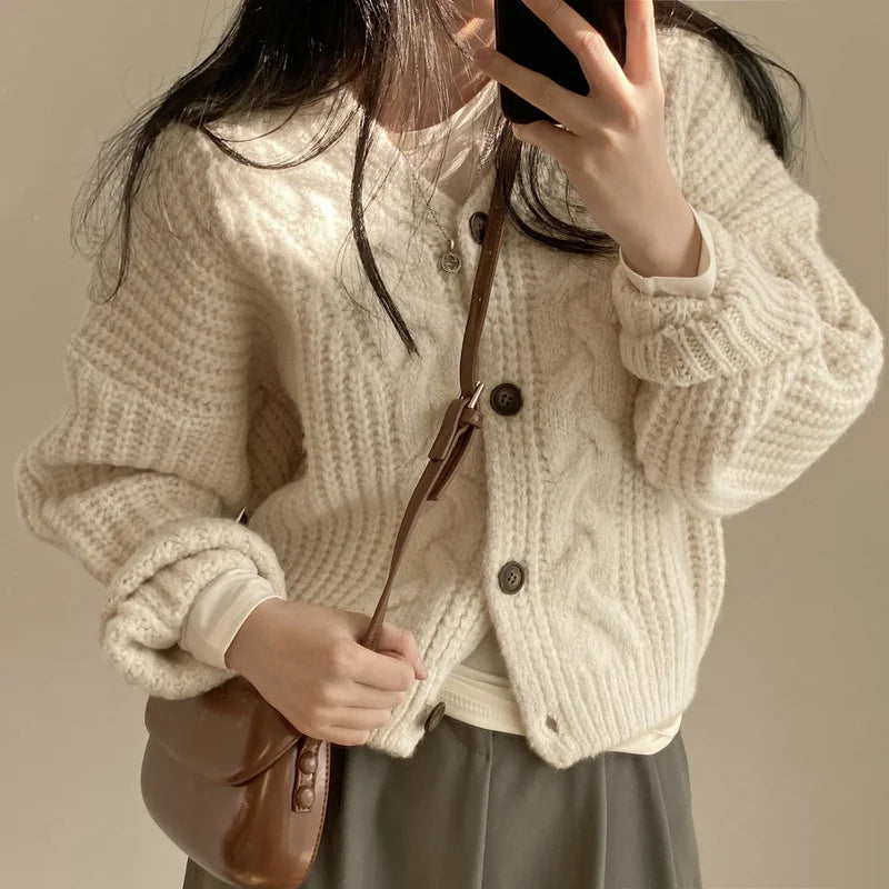 Apporte une touche douce et cosy à ta tenue avec ce cardigan beige en maille pour femme, parfait pour l’hiver. Son tricot à grosse maille offre une sensation enveloppante et agréable, tout en restant souple grâce à sa forte élasticité. Sa coupe loose assure un tombé confortable, idéal à porter au quotidien sur un top ou un pull fin. Le col en V et la fermeture boutonnée en font une pièce facile à associer, pour un look casual et chaleureux.