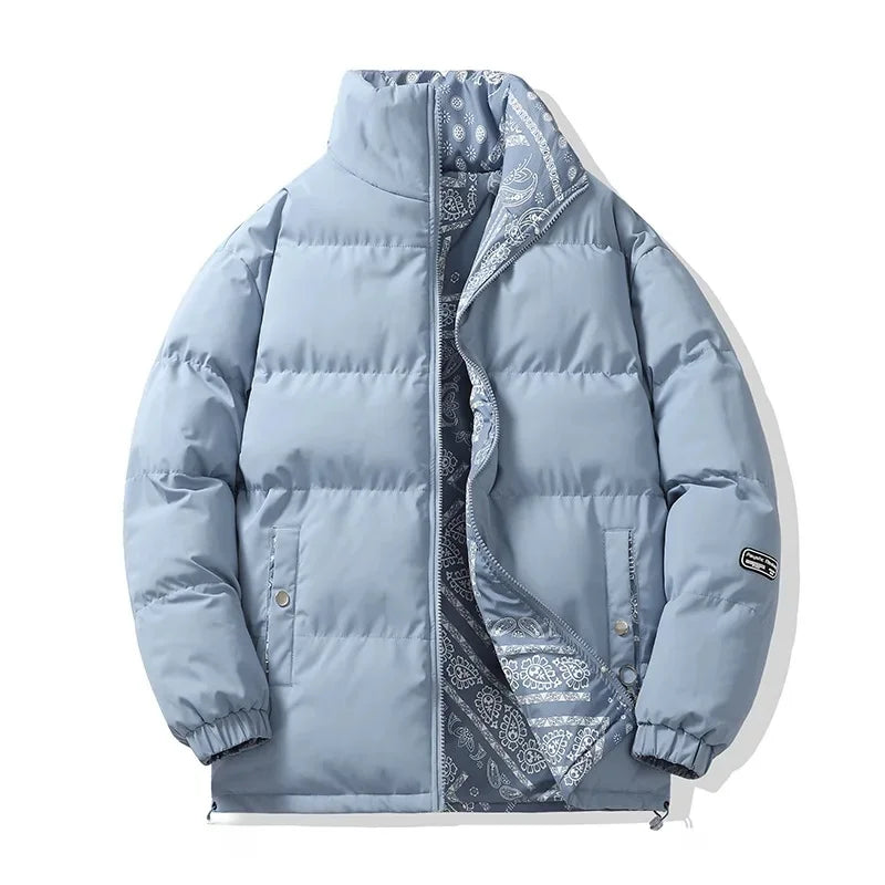 Apporte une touche originale et tendance à ton vestiaire d’automne et d’hiver avec cette doudoune pour homme de couleur bleu clair réversible. Son matelassage horizontal crée un relief régulier qui apporte du volume tout en conservant une silhouette fluide. L’intérieur contrastant à motif bandana ajoute un détail visuel distinctif et renforce l’inspiration streetwear. La matière en coton offre un toucher doux et agréable, tandis que la coupe loose garantit un confort optimal au quotidien. Le col montant et la fermeture zippée assurent une protection efficace contre le froid. Une doudoune polyvalente, idéale pour un look casual inspiré de la mode coréenne.