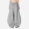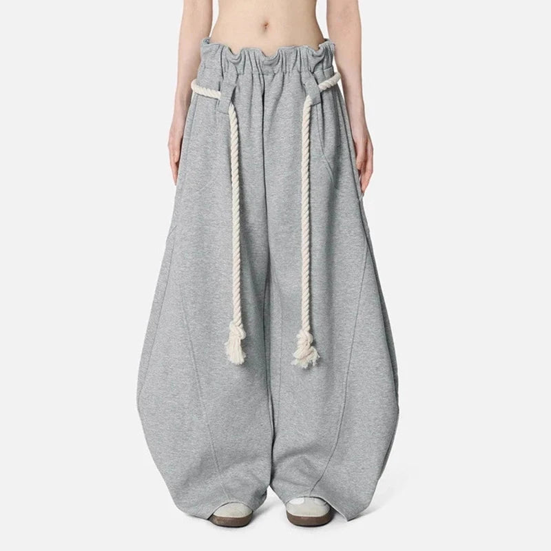 Ce jogging extra-large apporte une esthétique audacieuse, parfaite pour un look streetwear ou festival. Sa taille froncée, accompagnée d’un long cordon façon corde, crée un style unique et assumé. La coupe extrêmement ample offre un confort total tout en donnant une silhouette très moderne.
