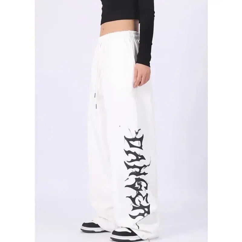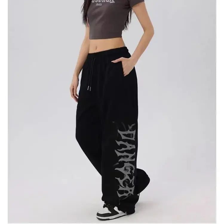 Ce jogging à coupe ample apporte une touche gothique avec son imprimé sur le bas de la jambe, inspiré des looks hip-hop et danse urbaine. Sa taille haute élastiquée avec cordon permet un ajustement confortable, tout en mettant la silhouette en valeur. Léger, fluide et facile à porter, il convient aussi bien pour les entraînements que pour un look décontracté du quotidien.