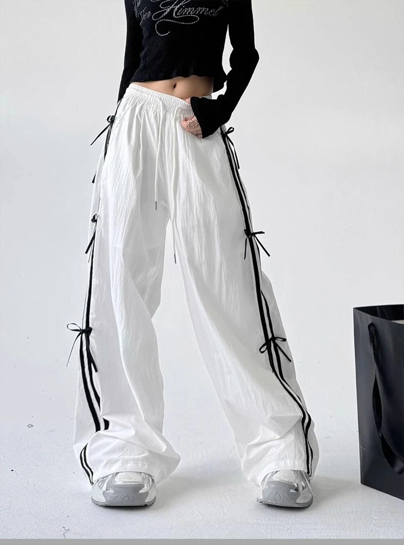 Ce pantalon cargo blanc large affiche un look street ultra distinctif grâce à ses liens contrastés noirs placés tout le long des jambes, qui se terminent en petits nœuds visibles. C’est exactement ce détail qui fait toute l’identité de ce modèle : ces nœuds apportent relief, style et un côté plus travaillé que les simples bandes latérales classiques.