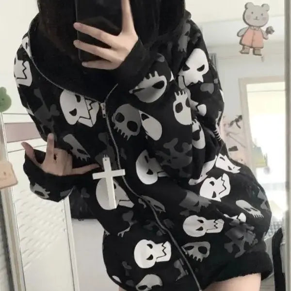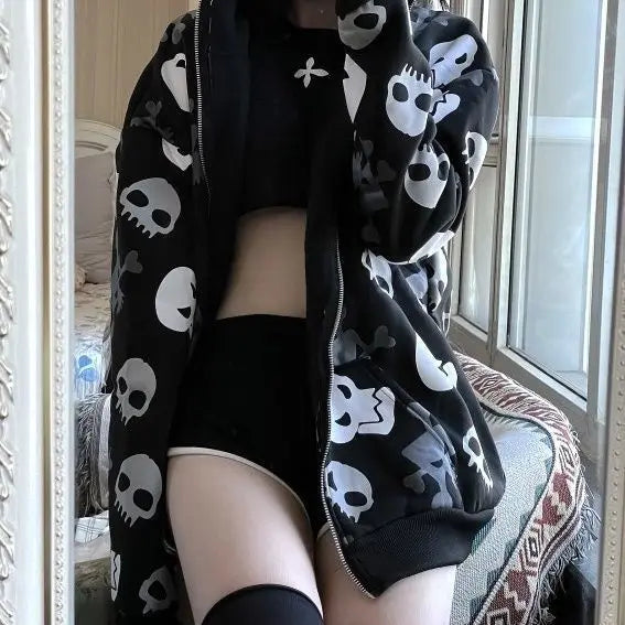 Ce hoodie zippé noir avec imprimé skulls impose un vrai mood underground. Un parfait mélange entre goth, grunge et Y2K. Sa coupe casual et sa capuche te permettent de le porter aussi bien en outfit chill qu’en look affirmé. À matcher avec un jean noir, un cargo ou un mini short pour une vibe rebelle assumée.