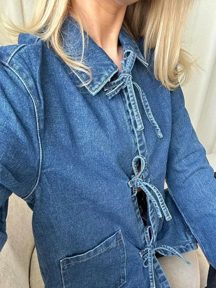 Adopte un style moderne et minimaliste avec cette veste en denim aux attaches nouées. Sa coupe droite et son denim légèrement stretch offrent un confort parfait pour le quotidien, tout en gardant une allure soignée. Les liens à nouer sur l’avant apportent une touche originale qui distingue cette pièce des vestes en jean classiques. Facile à porter avec un jean, un pantalon large ou même une jupe.