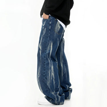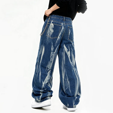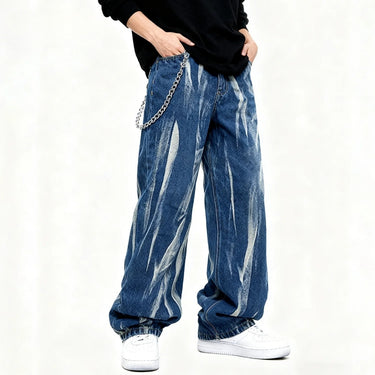 Ce jean large à motif abstrait combine un style artistique et une allure urbaine affirmée. Les effets délavés verticaux apportent du relief au denim, créant un design visuel unique inspiré du streetwear moderne.