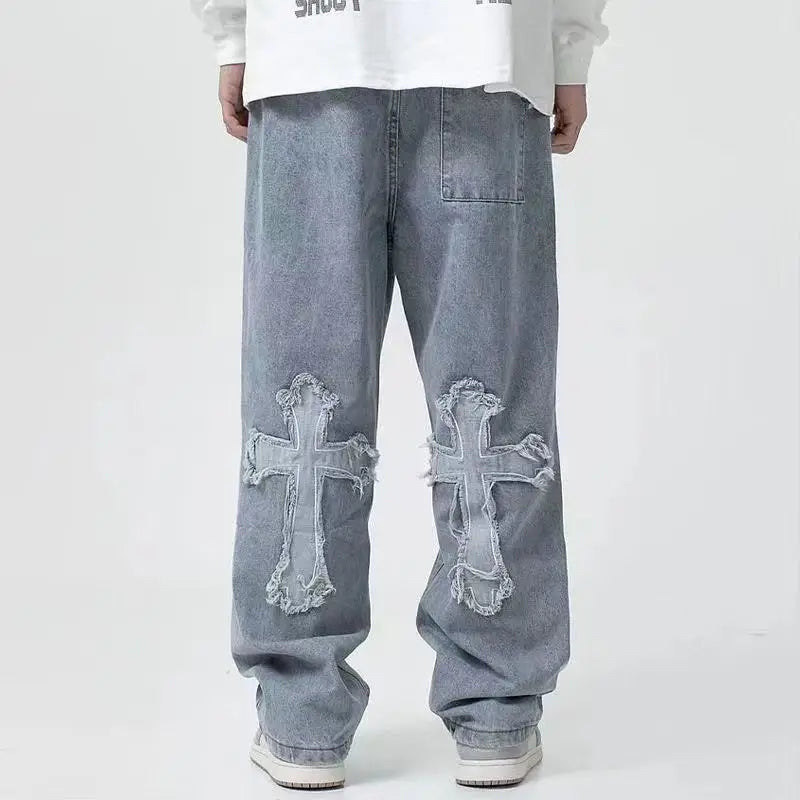 Ce jean baggy bleu clair se distingue par ses appliques en forme de croix ton sur ton, cousues sur l’ensemble du denim. Sa coupe ample et son tissu doux légèrement extensible offrent confort et liberté de mouvement, tout en affichant un style affirmé.