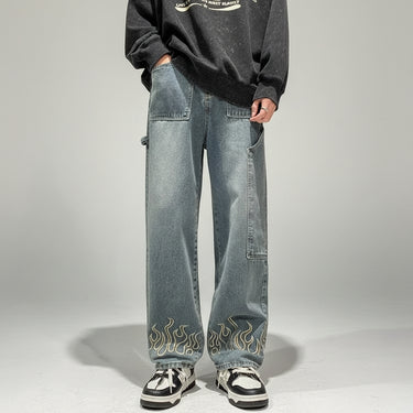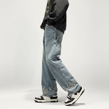 Ce jean baggy bleu combine une coupe large et un design audacieux avec des broderies flamme sur le bas des jambes. Confectionné en denim résistant, il affiche un look streetwear affirmé grâce à ses grandes poches latérales et son effet délavé.