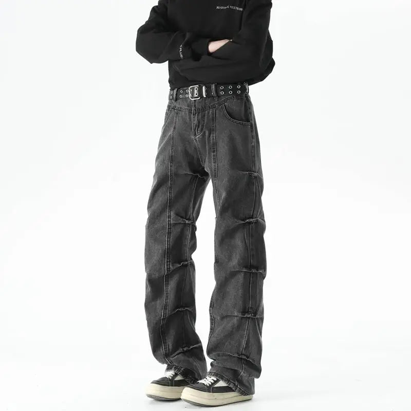 Ce jean baggy à plis se distingue par ses coutures nouées sur toute la longueur, apportant un effet texturé original. Sa coupe ample et son style coréen en font une pièce phare pour un look moderne et décontracté.