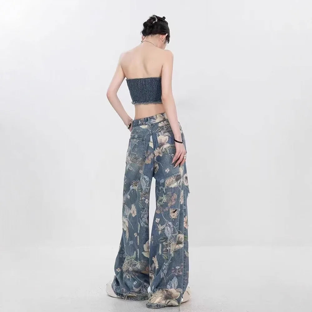 Ce jean large à fleurs déchiré revisite le denim classique avec une touche artistique et vintage. Son imprimé floral délicat contraste avec ses déchirures audacieuses pour un look à la fois bohème et streetwear.
