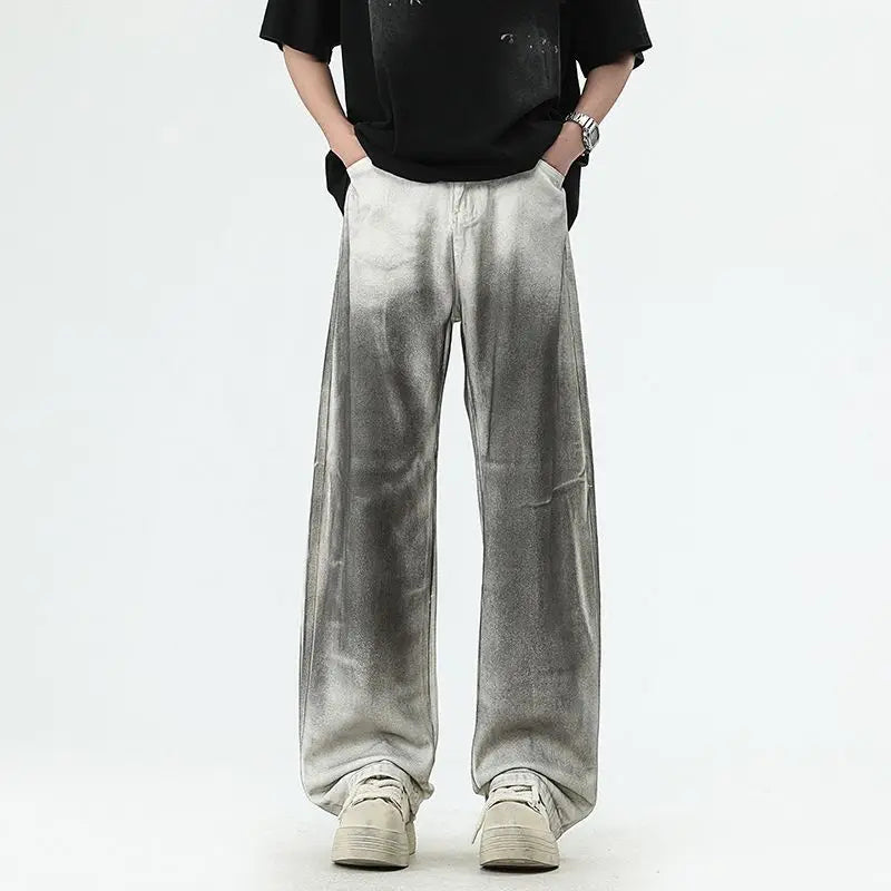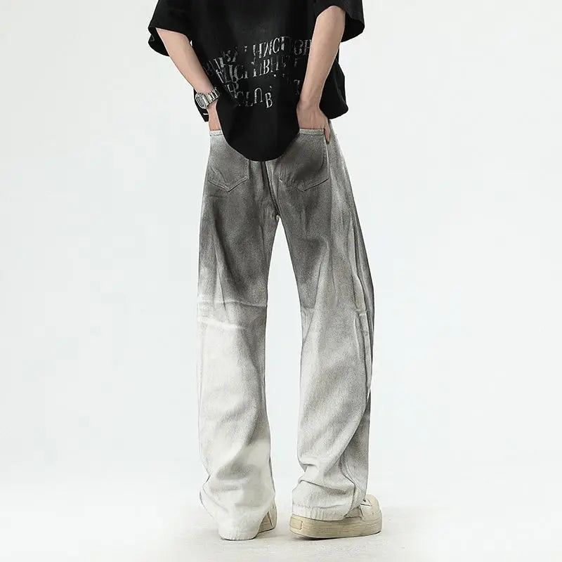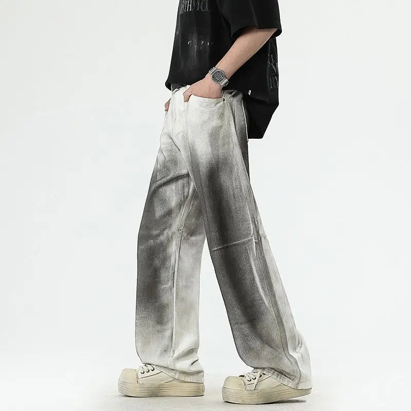 Ce jean baggy gris dégradé présente un effet visuel unique avec un délavage progressif du noir au blanc. Sa coupe large et droite met en avant un style moderne et original. Le denim souple en coton apporte confort et fluidité.