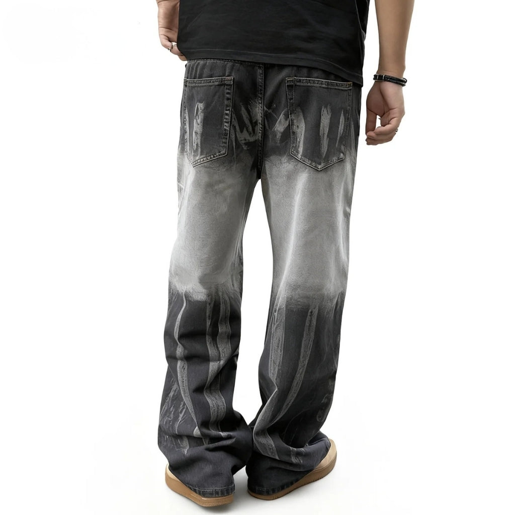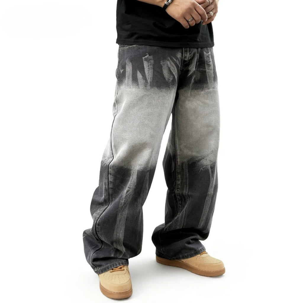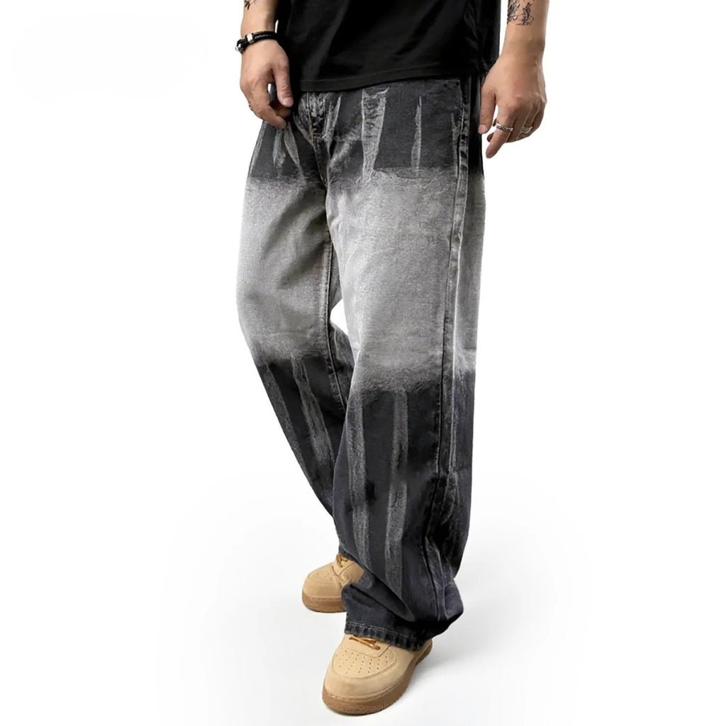 Ce jean large effet dégradé affiche une esthétique américaine rétro avec son contraste noir et gris qui attire le regard. Sa coupe ample assure confort et aisance, parfaite pour un look streetwear affirmé.