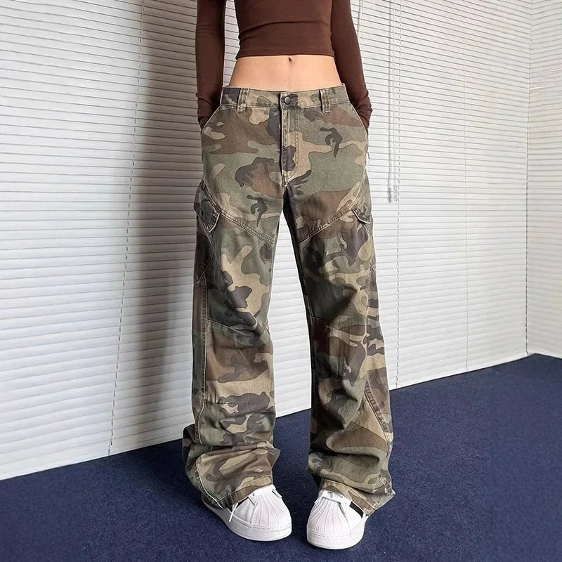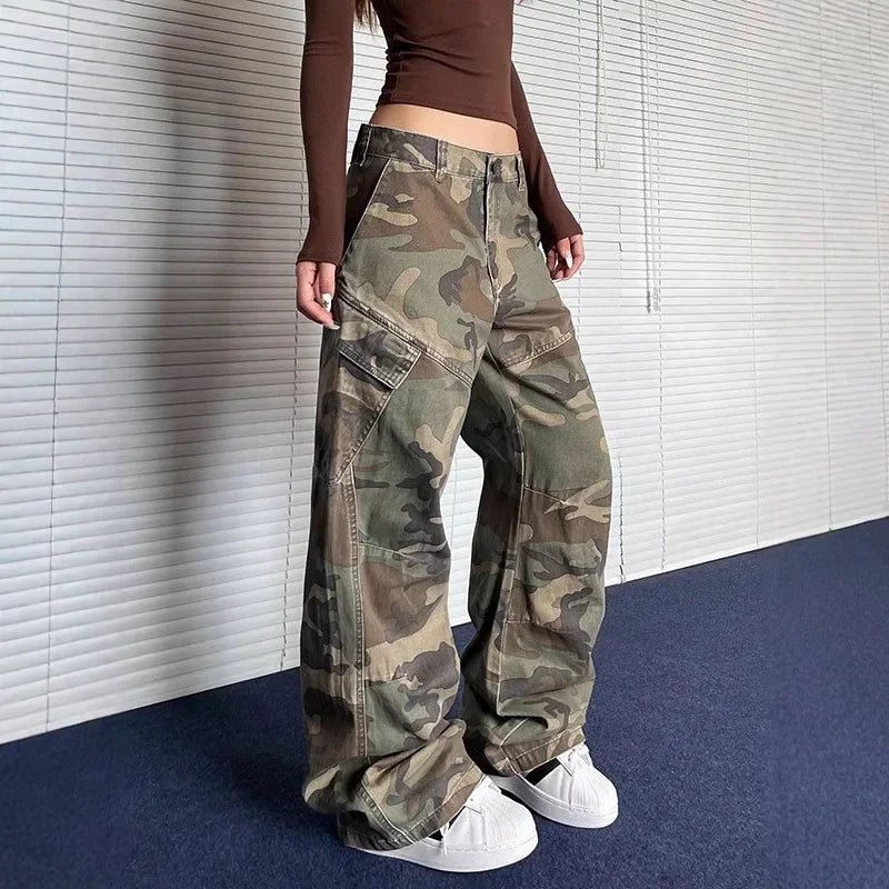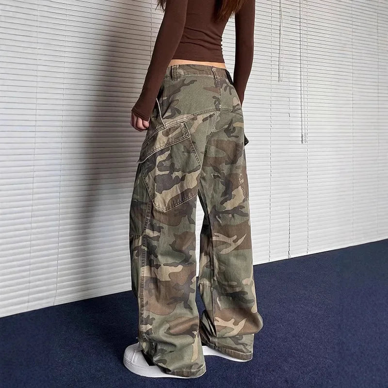 Pantalon camo loose style militaire pour femme. Parfait pour un look street décontracté avec un tombé relâché sur le bas. Peut se porter avec crop top, hoodie, bomber ou veste denim.