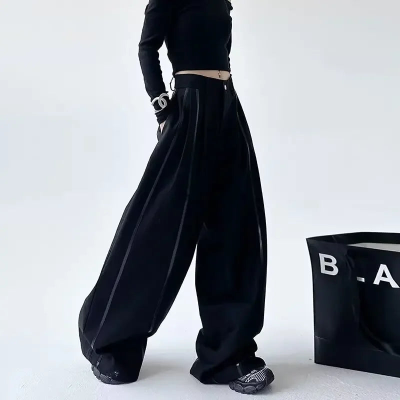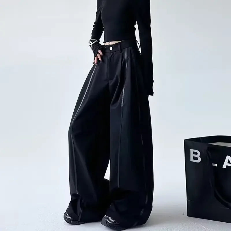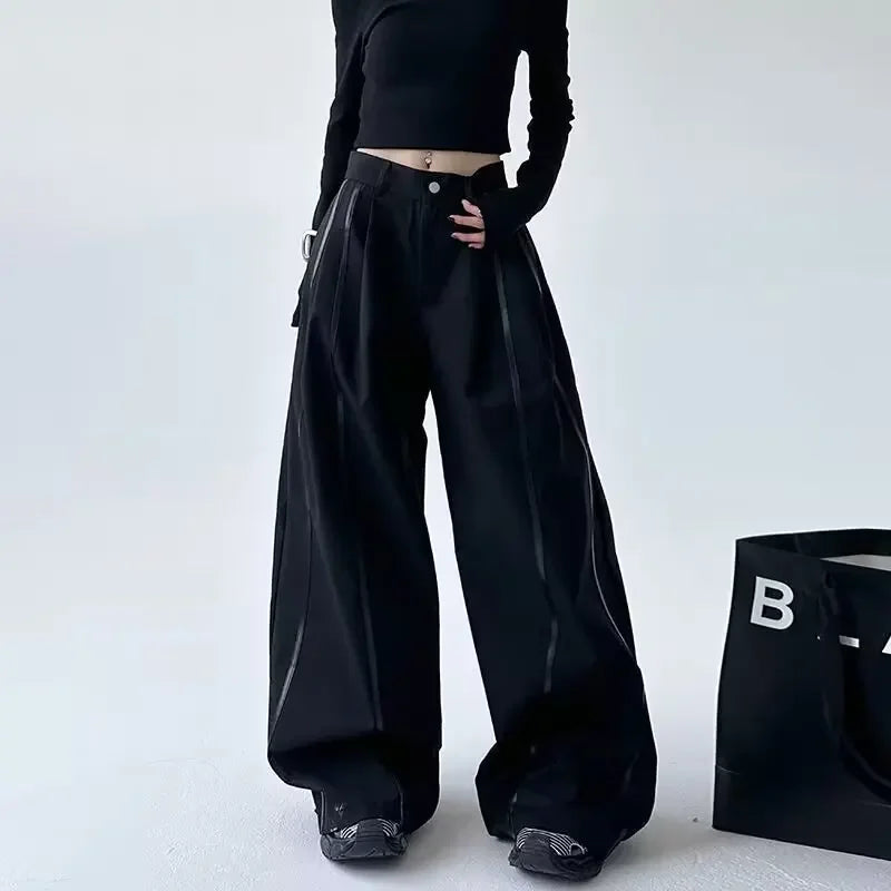 Ce pantalon noir extra large apporte une allure très marquée et moderne, avec un volume ultra ample qui donne un tombé visuel spectaculaire. La coupe droite très large permet de créer facilement des silhouettes fortes, surtout associée à un top noir ajusté ou des sneakers massives. Les détails imitation cuir sur le haut de jambe ajoutent un contraste visuel discret mais stylé.