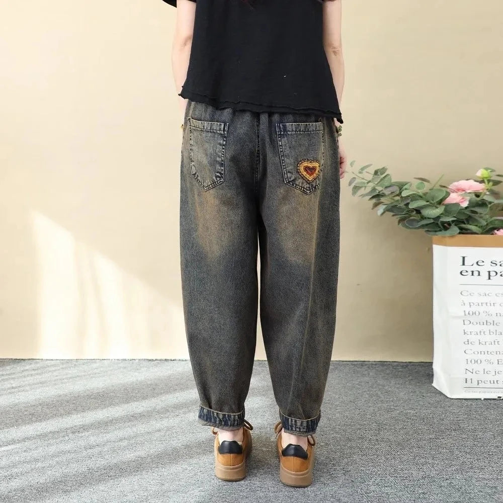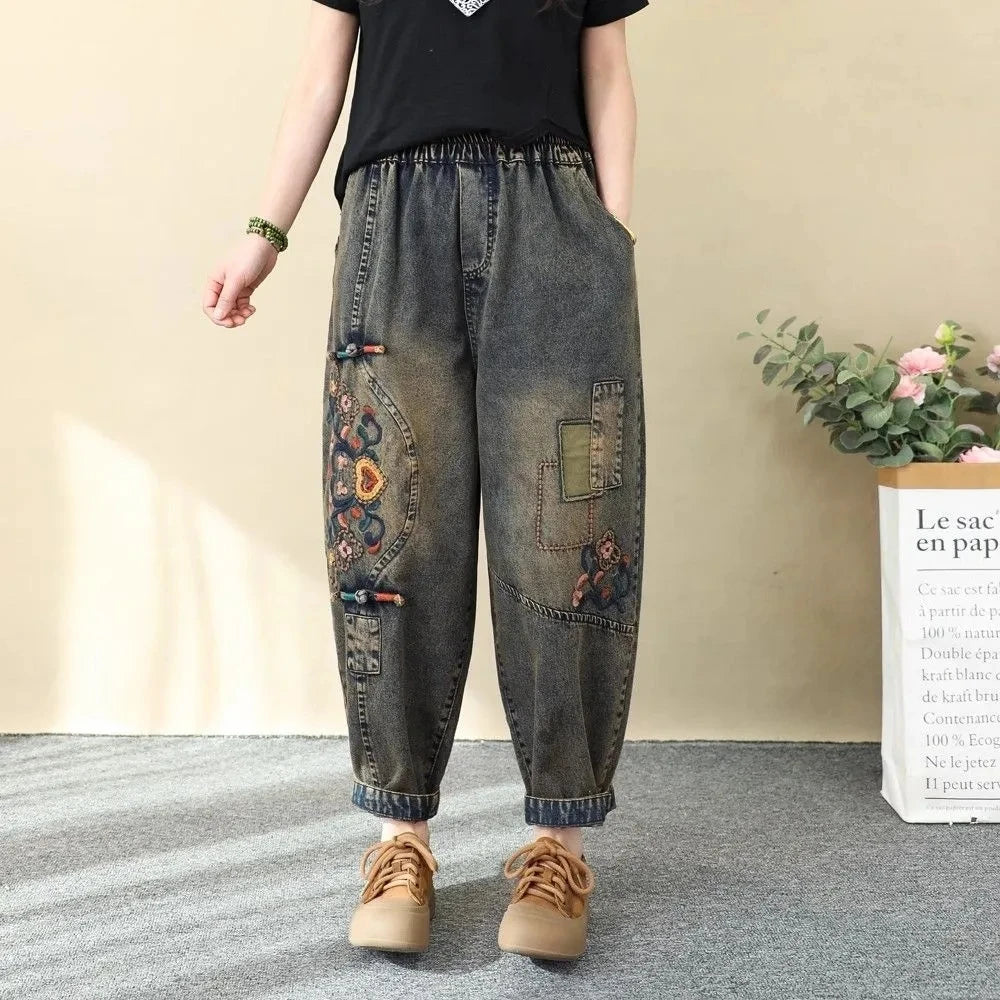 Ce jean harem adopte un style très moderne avec ses broderies colorées et ses petits détails cousus qui donnent tout de suite du caractère au pantalon. La coupe est ample et plus resserrée en bas, ce qui crée un volume visuel original, très différent d’un jean droit classique.