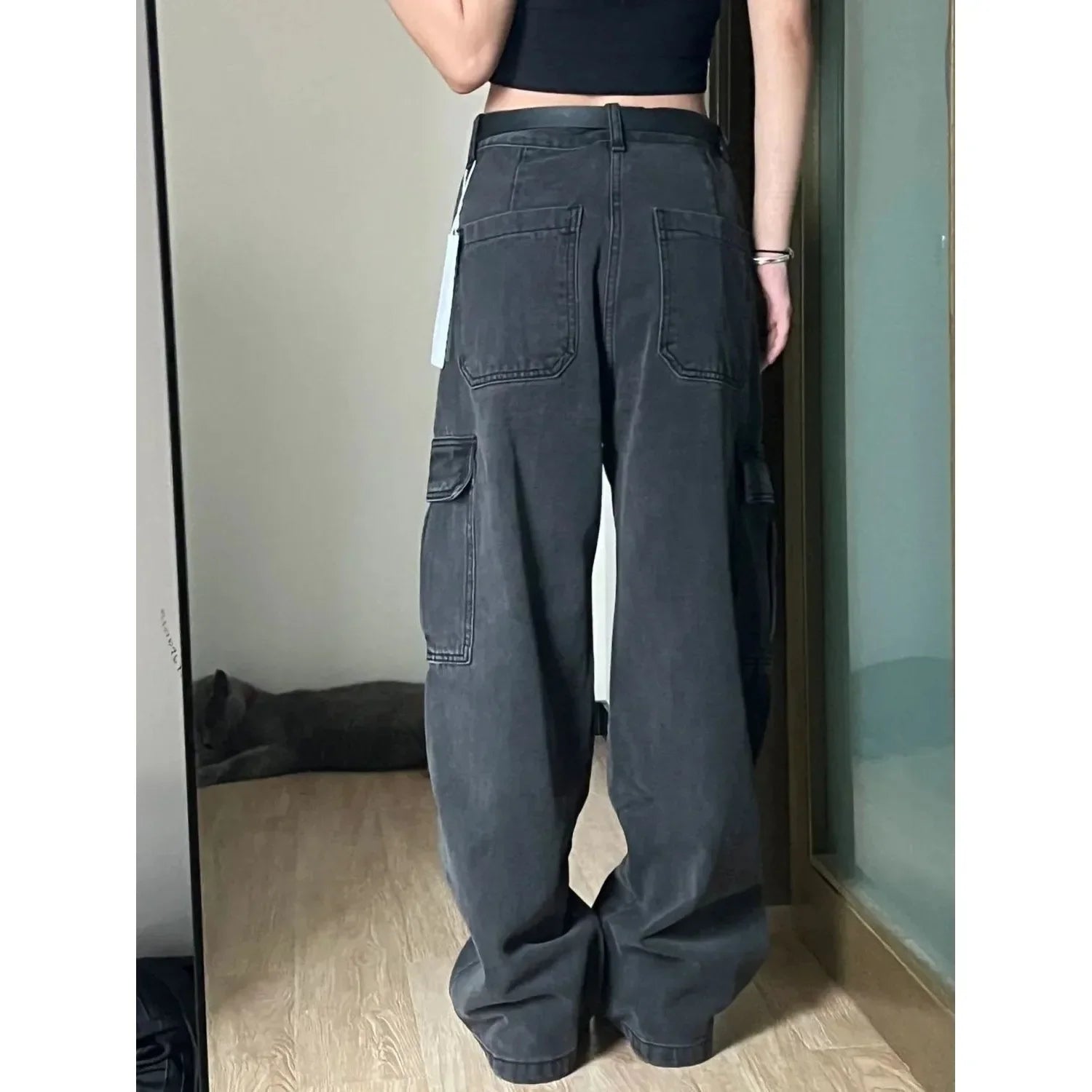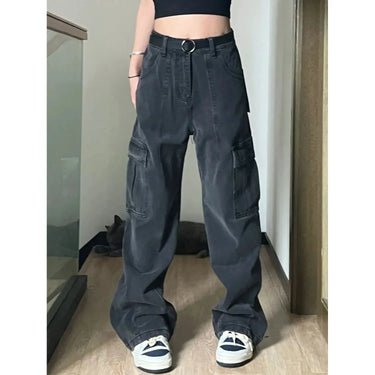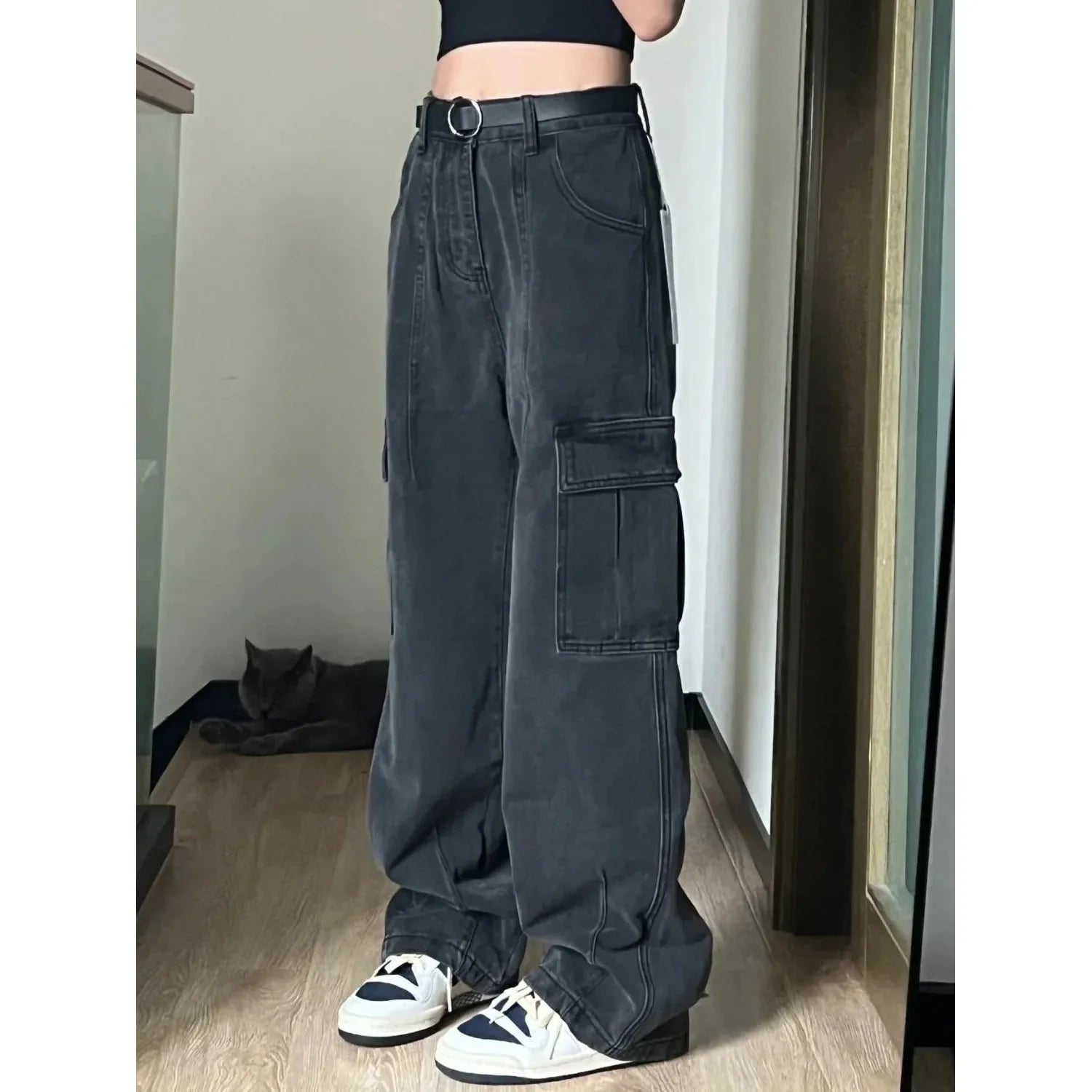 Pantalon cargo femme en denim bleu marine effet délavé ultra large avec taille haute. Style casual très tendance avec une jambe très ample qui tombe sur la chaussure pour un look streetwear assumé. La grande poche latérale ajoute une touche utilitaire moderne.