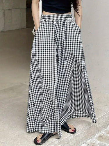 Pantalon pour femme coupe large effet évasé motif carreaux noir et blanc super léger parfait pour les journées relax au quotidien. Taille élastique très confortable avec poches pratiques. Modèle casual facile à porter avec un top noir ou blanc