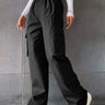 Pantalon cargo large pour femme au look street très tendance hyper facile à associer avec crop top manches longues ou simple t-shirt. Coupe droite large confortable taille haute élastique avec poches cargo latérales pour un style casual moderne du quotidien