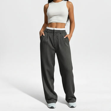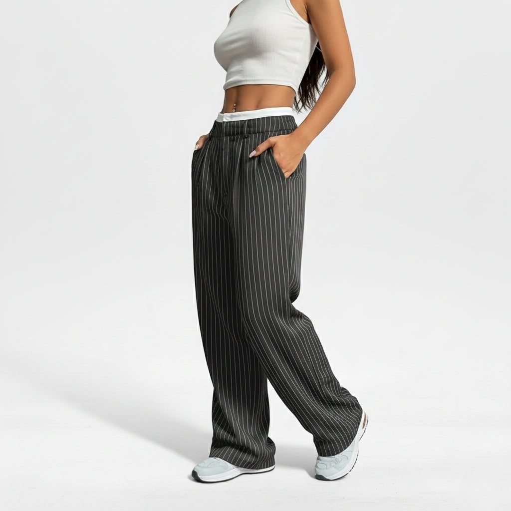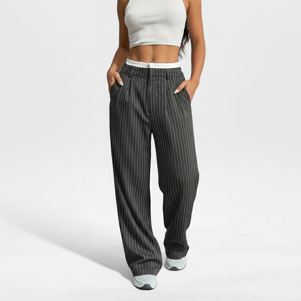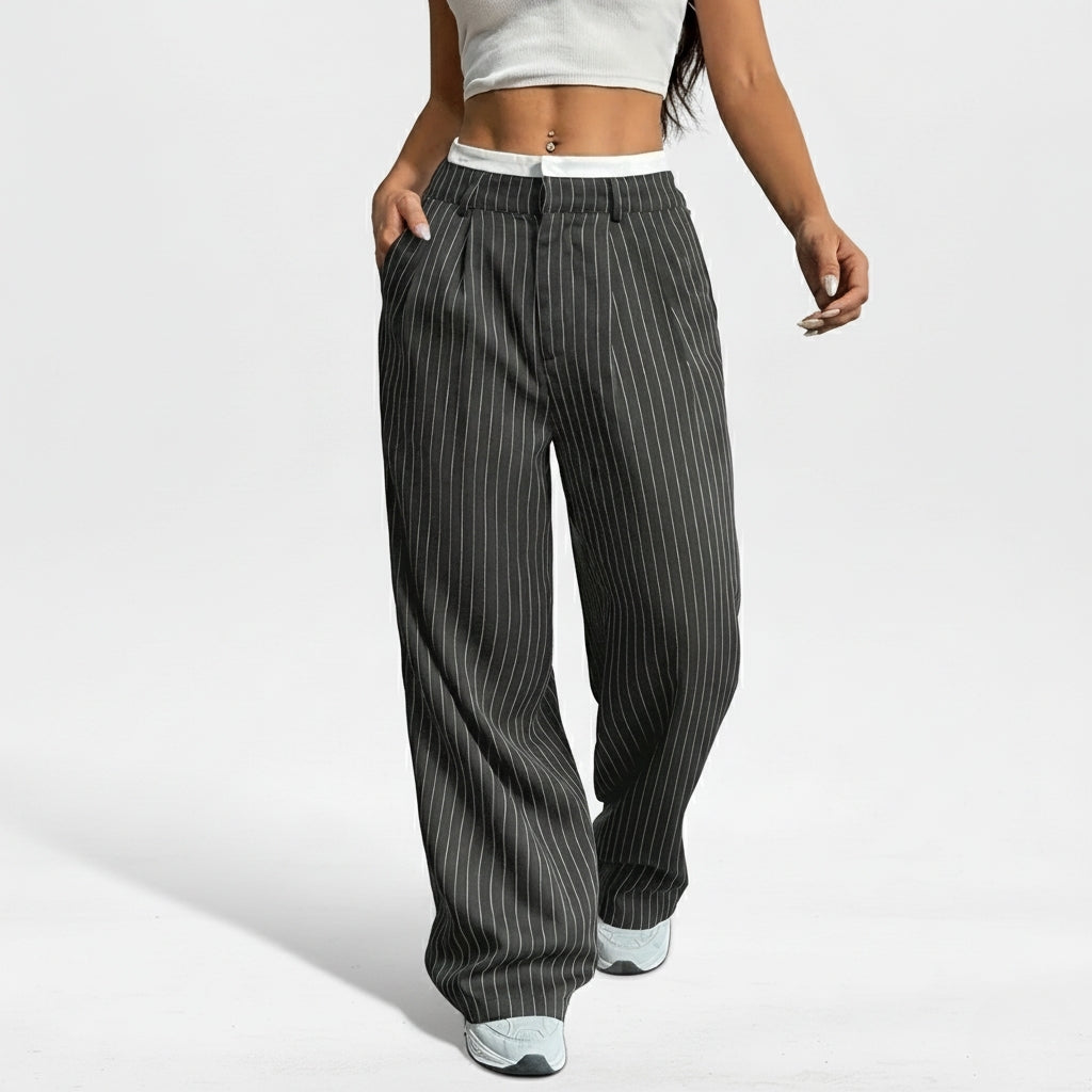 Ce pantalon large gris à fines rayures verticales apporte immédiatement un rendu plus travaillé sans en faire trop. La taille haute structure la silhouette, tandis que les rayures allongent visuellement les jambes et donnent une ligne propre et affirmée.