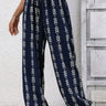 Pantalon femme style hippie avec imprimé géométrique blanc inspiré ethnic chic. Taille haute élastique avec cordon de serrage. Léger et agréable sur la peau, idéal en été ou pour une journée plage. À porter avec un top blanc et des sandales pour un look détente stylé.