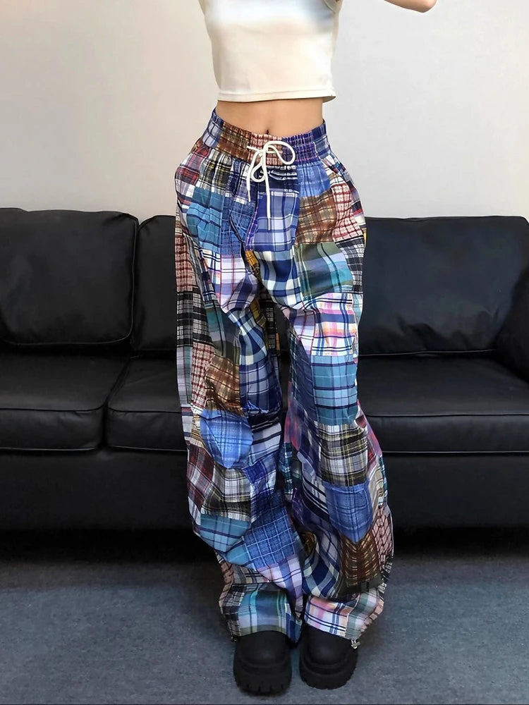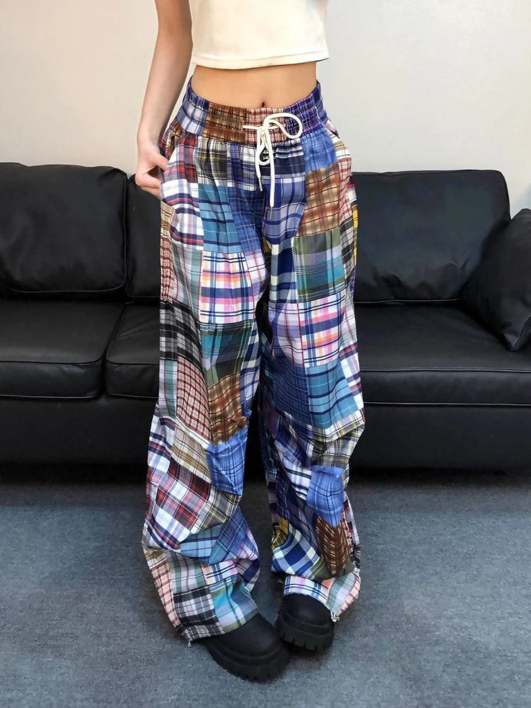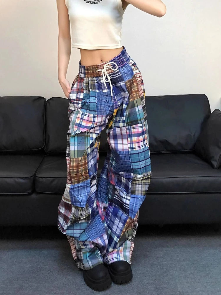 Pantalon large pour femme imprimé patchwork à carreaux colorés dans un style streetwear ultra tendance. Ce modèle se porte taille haute avec une ceinture élastique et cordon ajustable. Tombé fluide pour un effet oversize assumé. Parfait avec un crop top blanc et des baskets pour un look hip hop moderne.
