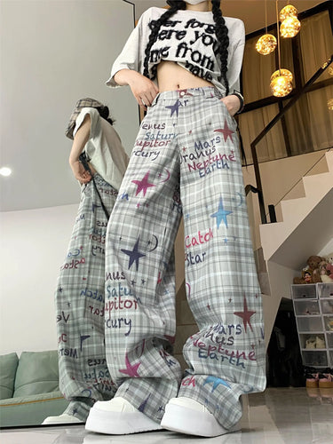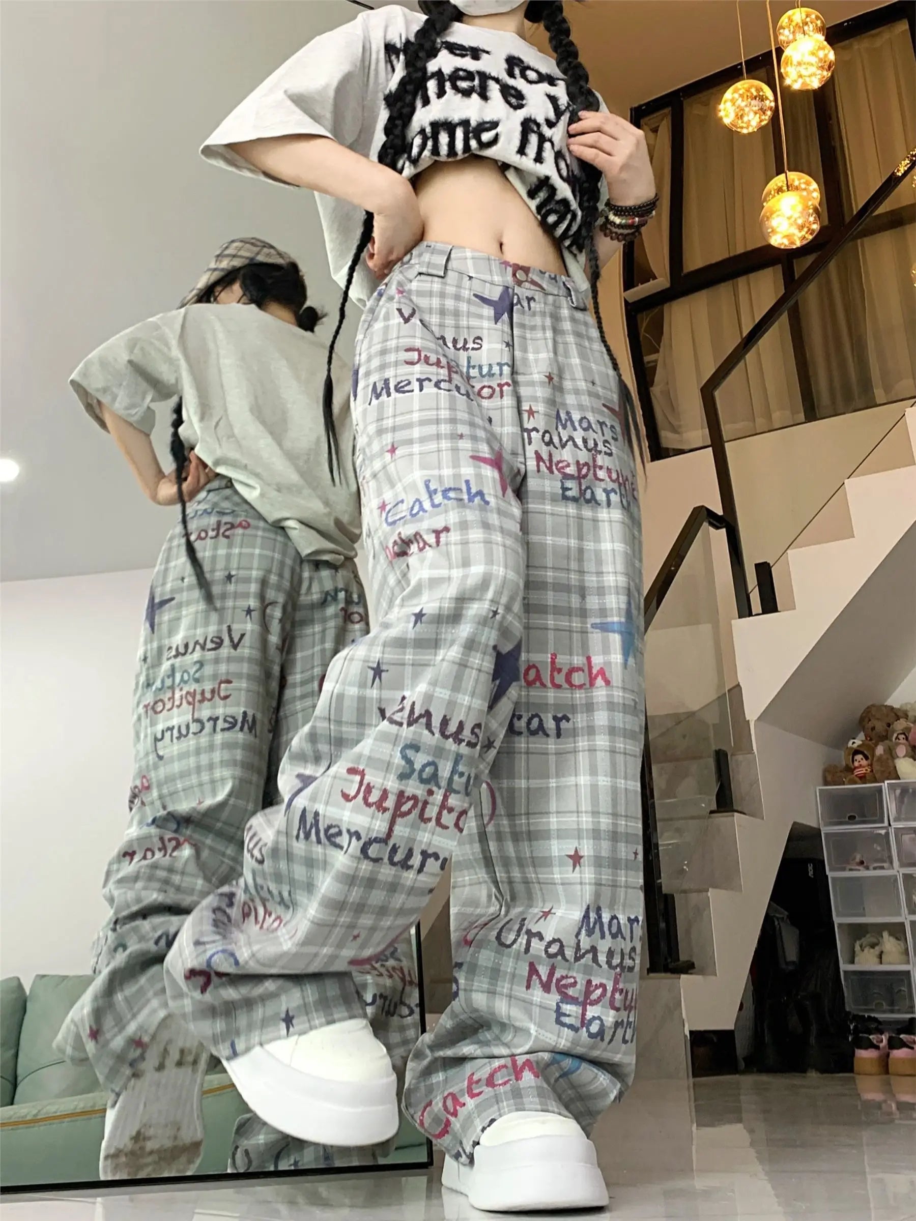 Ce pantalon large affiche un motif original inspiré des planètes et du thème spatial, ce qui lui donne un look fun et différent des modèles classiques unis. La base à carreaux gris apporte une structure visuelle, tandis que les écritures colorées et les étoiles ajoutent un côté créatif très assumé. La coupe est ample, longue, parfaitement dans la tendance loose actuelle, et la taille intermédiaire le rend facile à porter au quotidien.