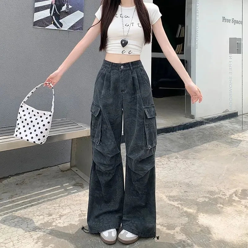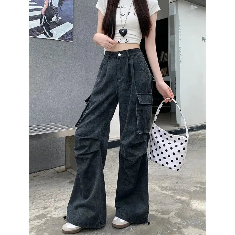 Ce pantalon cargo noir adopte un look très street avec ses poches oversize façon multi-couches qui créent un relief visuel fort. Le denim légèrement délavé apporte un côté plus brut, très inspiré des jeans utilitaires. La taille haute structure la silhouette, et la jambe est large jusqu’en bas, avec un effet bien fluide quand tu marches.