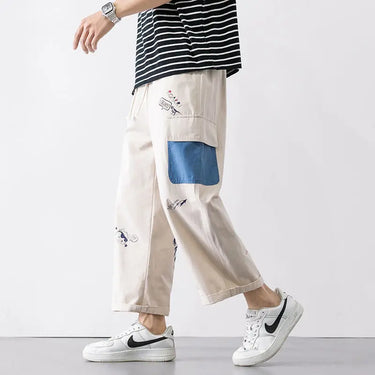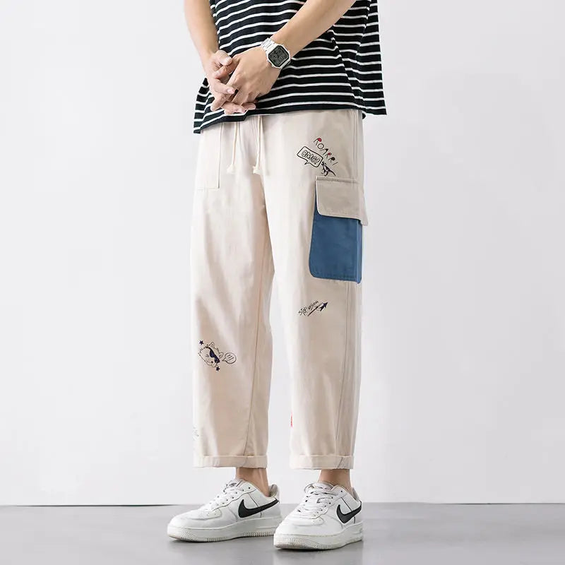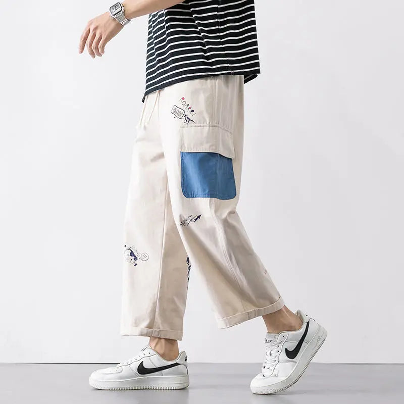 Ce pantalon cargo beige imprimé apporte une touche fun et urbaine avec ses petits dessins stylisés et son panneau contrasté bleu sur la poche. Sa coupe ample permet un tombé confortable et léger, idéal pour la belle saison. Parfait pour ceux qui aiment les pièces originales mais faciles à porter, il se combine très bien avec un t-shirt oversize, une chemise fluide ou un hoodie clair pour un outfit casual et actuel.